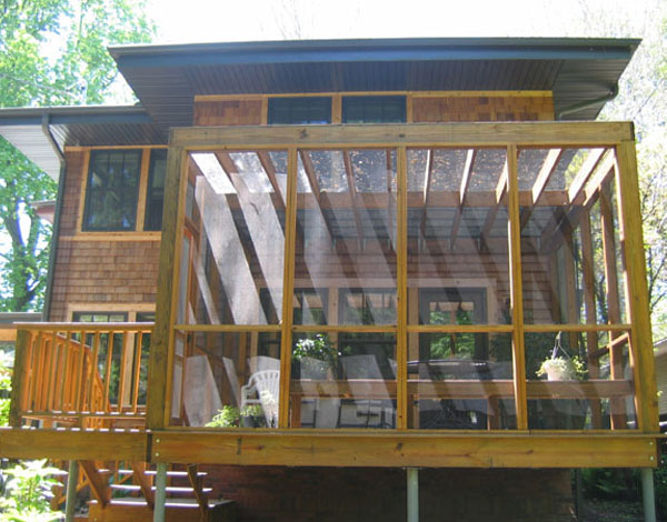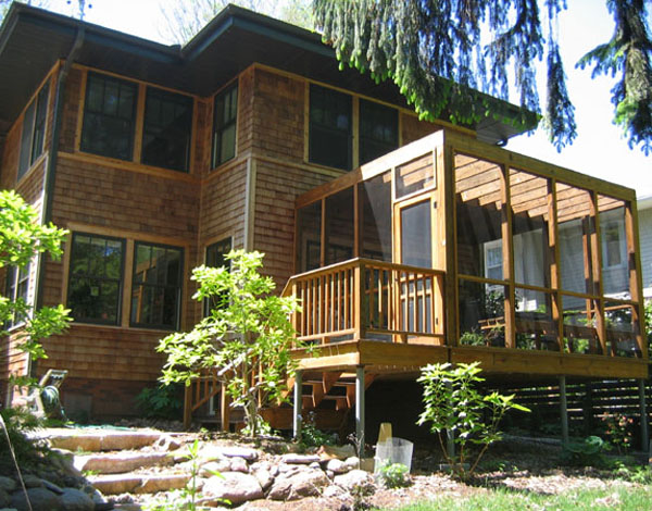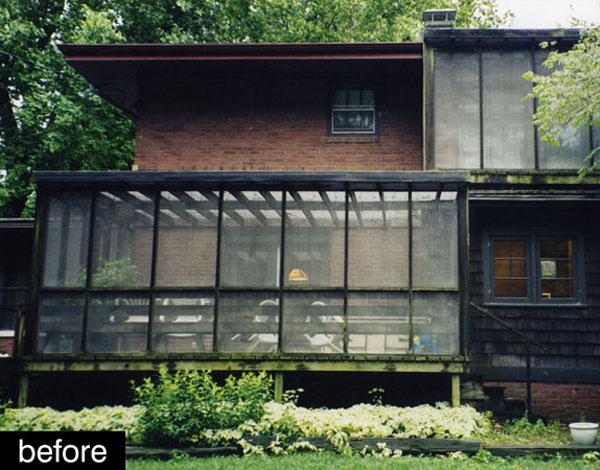 The program called for a Living space, a Bedroom, a Study and a Screened Porch. Additionally, a new rear Entry/Mudroom with a Patio connection to the detached Garage was incorporated. Reorganized Dining and Sunroom spaces create more usable Living space.