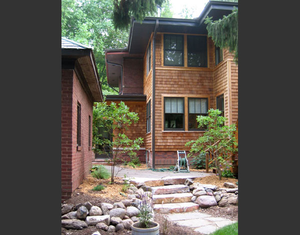 The addition is deferential to the original house from the street, but opens to the rear yard with a series of setbacks facilitating an abundance of natural light and a strong connection to the outdoors. The cedar shingle siding complements the original brick structure and gives the addition an identity of its own.