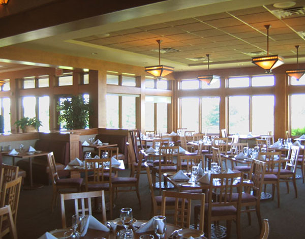 Like the Clubhouse, Kennedy's was designed to take full advantage of the golf course vistas. The open plan series of dining and bar spaces enables all patrons to benefit from natural light and the view, and the exterior dining spaces are oriented toward the fairways. A year round facility, Kennedy's interior design includes a central stone fireplace and extensive woodwork along with a warm, prairie palette.
